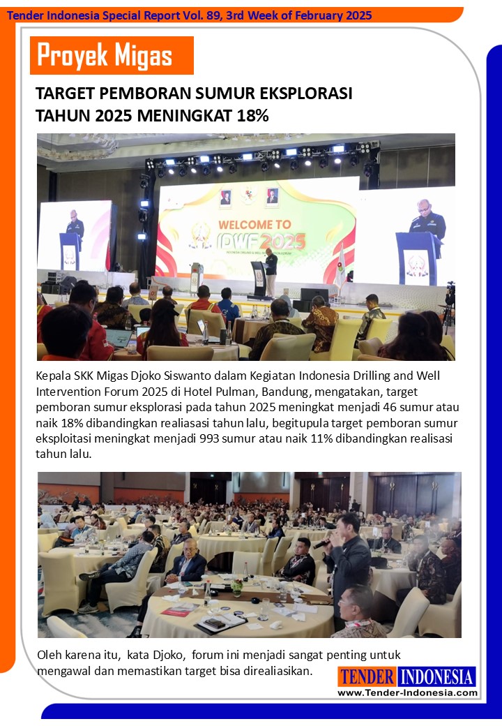 Kepala SKK Migas Djoko Siswanto dalam Kegiatan Indonesia Drilling and Well Intervention Forum 2025 di Hotel Pulman, Bandung, mengatakan, target pemboran sumur eksplorasi pada tahun 2025 meningkat menjadi 46 sumur atau naik 18% dibandingkan realiasasi tahun lalu, begitupula target pemboran sumur eksploitasi meningkat menjadi 993 sumur atau naik 11% dibandingkan realisasi tahun lalu.