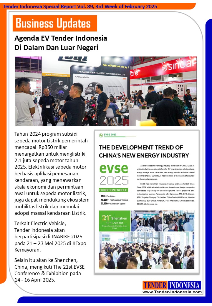 Tahun 2024 program subsidi sepeda motor Listrik pemerintah mencapai Rp350 miliar menargetkan untuk menglistriki 2,1 juta sepeda motor tahun 2025. Elektrifikasi sepeda motor berbasis aplikasi pemesanan kendaraan, yang menawarkan skala ekonomi dan permintaan awal untuk sepeda motor listrik, juga dapat mendukung ekosistem mobilitas listrik dan memulai adopsi massal kendaraan Listrik. Terkait Electric Vehicle, Tender Indonesia akan berpartisipasi di INABIKE 2025 pada 21 – 23 Mei 2025 di JIExpo Kemayoran.