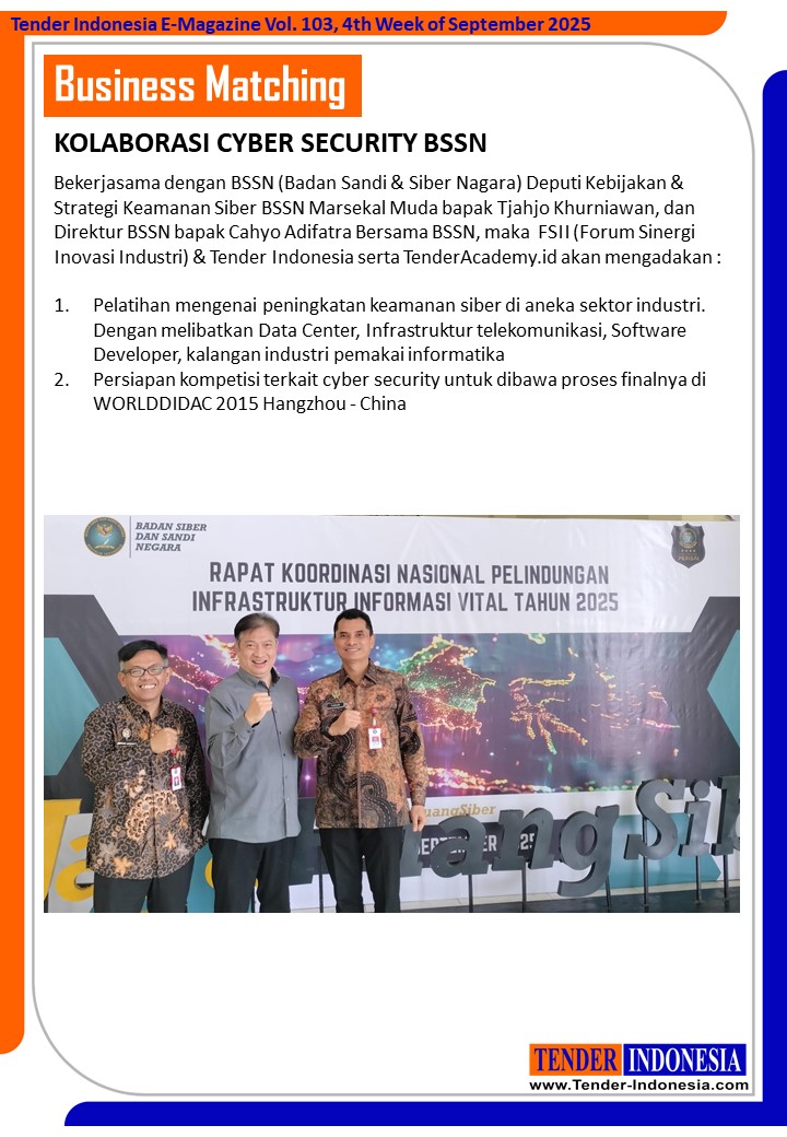 Bekerjasama dengan BSSN (Badan Sandi & Siber Nagara) Deputi Kebijakan & Strategi Keamanan Siber BSSN Marsekal Muda bapak Tjahjo Khurniawan, dan Direktur BSSN bapak Cahyo Adifatra Bersama BSSN, maka FSII (Forum Sinergi Inovasi Industri) & Tender Indonesia serta TenderAcademy.id akan mengadakan :