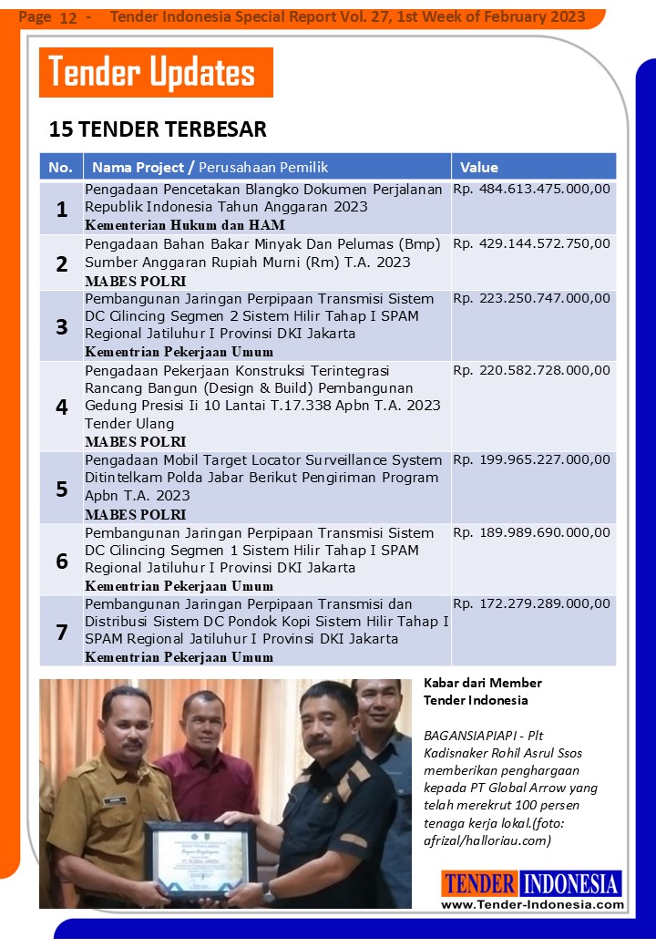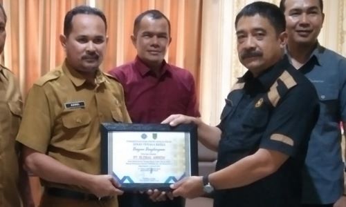 BAGANSIAPIAPI - Plt Kadisnaker Rohil Asrul Ssos memberikan penghargaan kepada PT Global Arrow yang telah merekrut 100 persen tenaga kerja lokal.(foto: afrizal/halloriau.com)
