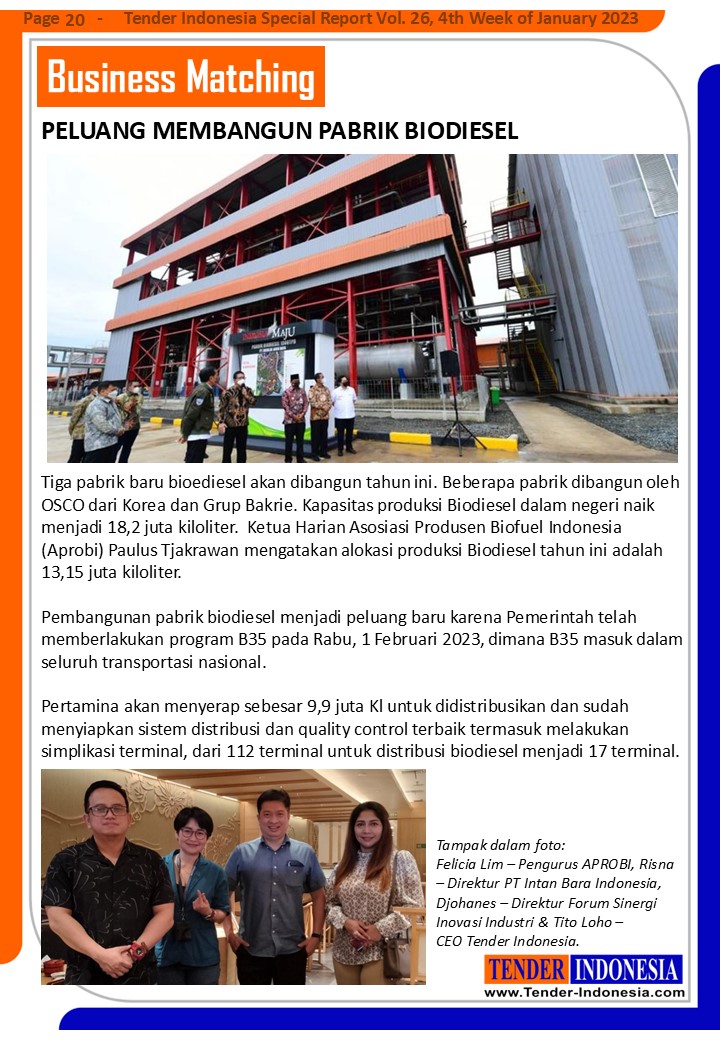 Pembangunan pabrik biodiesel menjadi peluang baru karena Pemerintah telah memberlakukan program B35 pada Rabu, 1 Februari 2023, dimana B35 masuk dalam seluruh transportasi nasional.