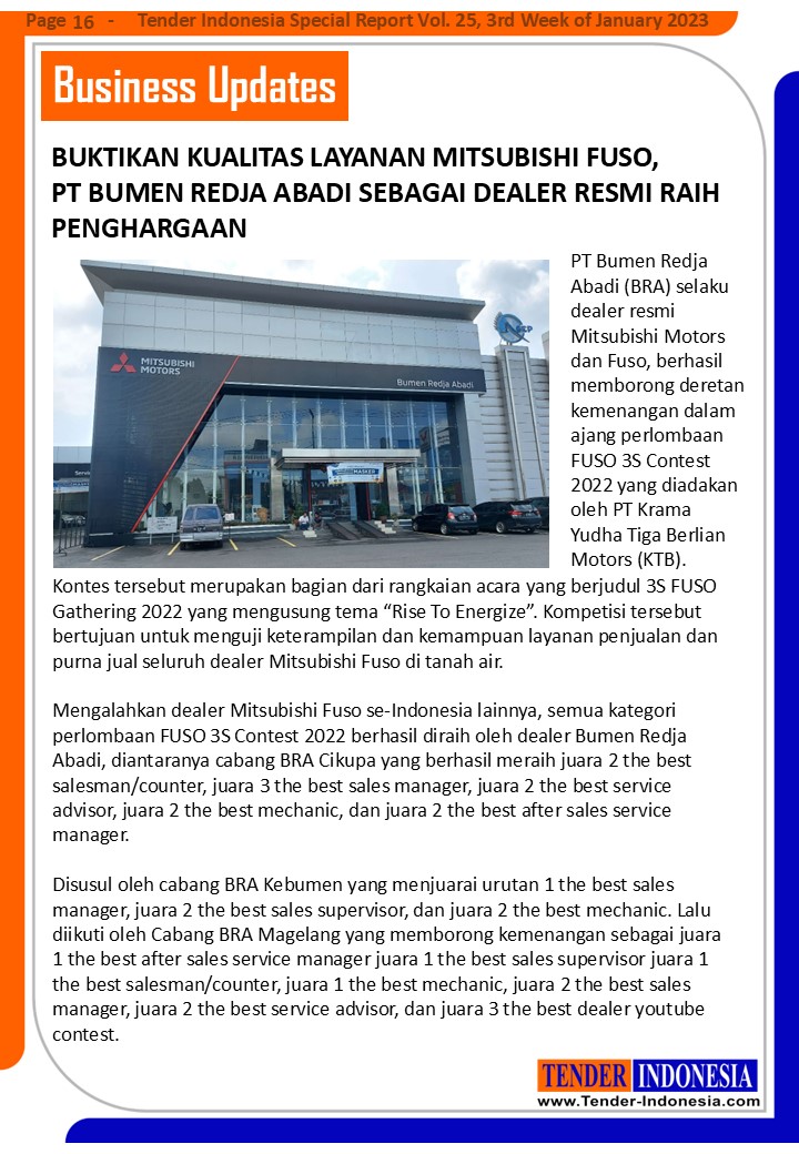 PT Bumen Redja Abadi (BRA) selaku dealer resmi Mitsubishi Motors dan Fuso, berhasil memborong deretan kemenangan dalam ajang perlombaan FUSO 3S Contest 2022 yang diadakan oleh PT Krama Yudha Tiga Berlian Motors (KTB). Kontes tersebut merupakan bagian dari rangkaian acara yang berjudul 3S FUSO Gathering 2022 yang mengusung tema “Rise To Energize”. Kompetisi tersebut bertujuan untuk menguji keterampilan dan kemampuan layanan penjualan dan purna jual seluruh dealer Mitsubishi Fuso di tanah air.