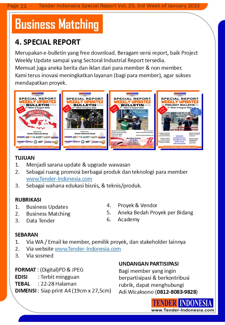 Merupakan e-bulletin yang free download. Beragam versi report, baik Project Weekly Update sampai yang Sectoral Industrial Report tersedia. Memuat juga aneka berita dan iklan dari para member & non member. Kami terus inovasi meningkatkan layanan (bagi para member), agar sukses mendapatkan proyek.