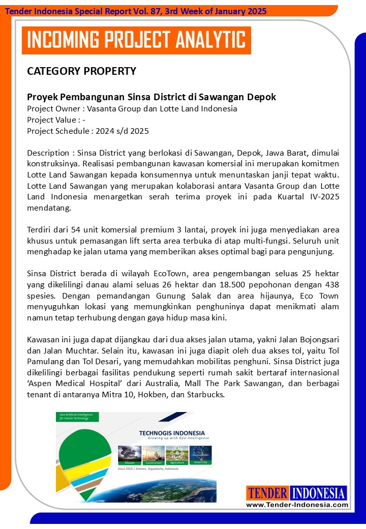 Description : Sinsa District yang berlokasi di Sawangan, Depok, Jawa Barat, dimulai konstruksinya. Realisasi pembangunan kawasan komersial ini merupakan komitmen Lotte Land Sawangan kepada konsumennya untuk menuntaskan janji tepat waktu. Lotte Land Sawangan yang merupakan kolaborasi antara Vasanta Group dan Lotte Land Indonesia menargetkan serah terima proyek ini pada Kuartal IV-2025 mendatang.