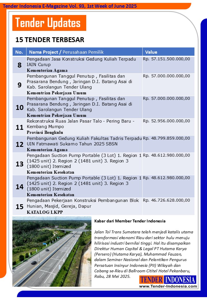 Jalan Tol Trans Sumatera telah menjadi katalis utama transformasi ekonomi Riau dari sektor hulu menuju hilirisasi industri bernilai tinggi. Hal itu disampaikan Direktur Human Capital & Legal PT Hutama Karya (Persero) (Hutama Karya), Muhammad Fauzan, dalam Seminar Nasional dan Pelantikan Pengurus Persatuan Insinyur Indonesia (PII) Wilayah dan Cabang se-Riau di Ballroom Cititel Hotel Pekanbaru, Rabu, 28 Mei 2025.