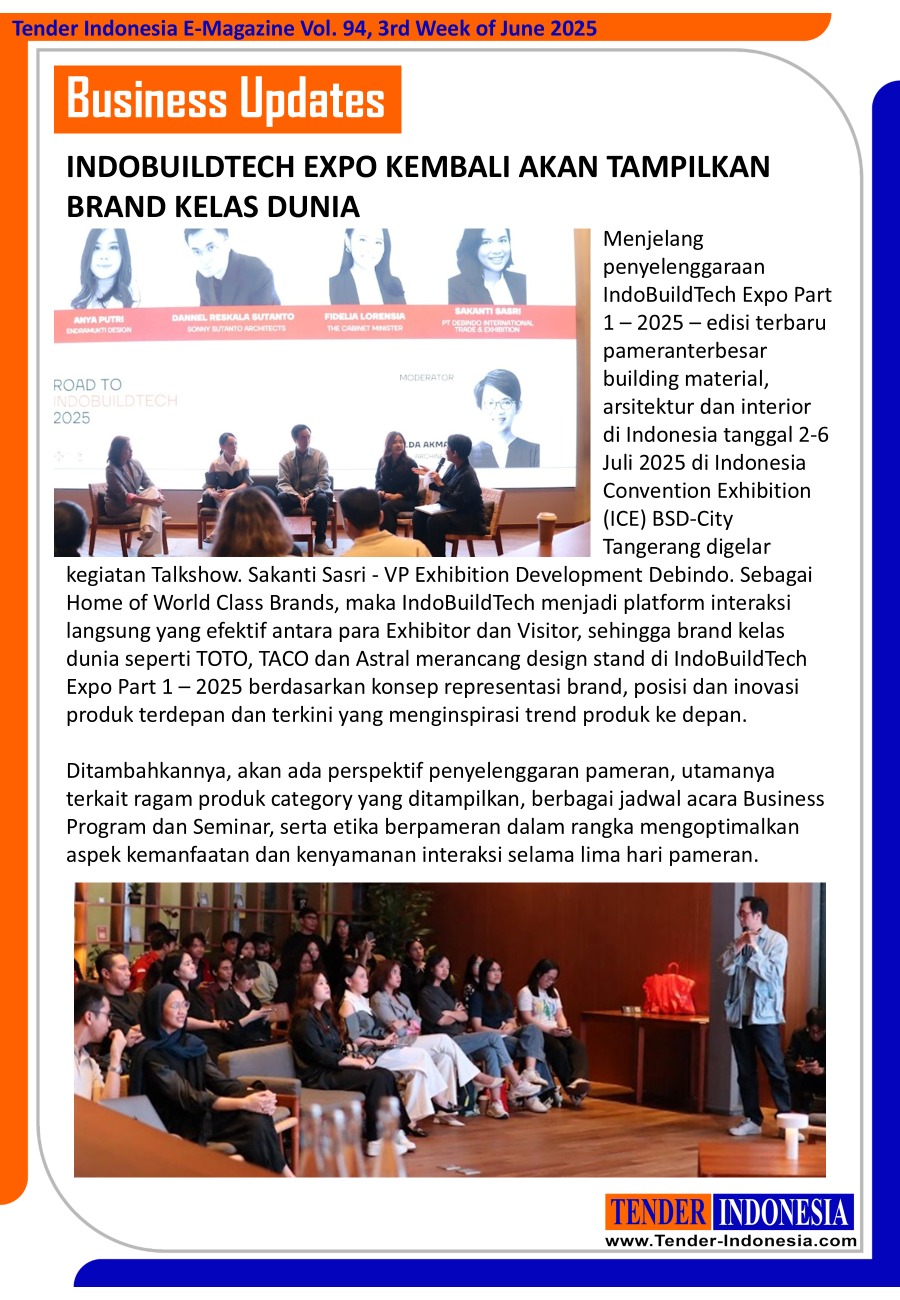 Menjelang penyelenggaraan IndoBuildTech Expo Part 1 – 2025 – edisi terbaru pameranterbesar building material, arsitektur dan interior di Indonesia tanggal 2-6 Juli 2025 di Indonesia Convention Exhibition (ICE) BSD-City Tangerang digelar kegiatan Talkshow. Sakanti Sasri - VP Exhibition Development Debindo. Sebagai Home of World Class Brands, maka IndoBuildTech menjadi platform interaksi langsung yang efektif antara para Exhibitor dan Visitor, sehingga brand kelas dunia seperti TOTO, TACO dan Astral merancang design stand di IndoBuildTech Expo Part 1 – 2025 berdasarkan konsep representasi brand, posisi dan inovasi produk terdepan dan terkini yang menginspirasi trend produk ke depan.