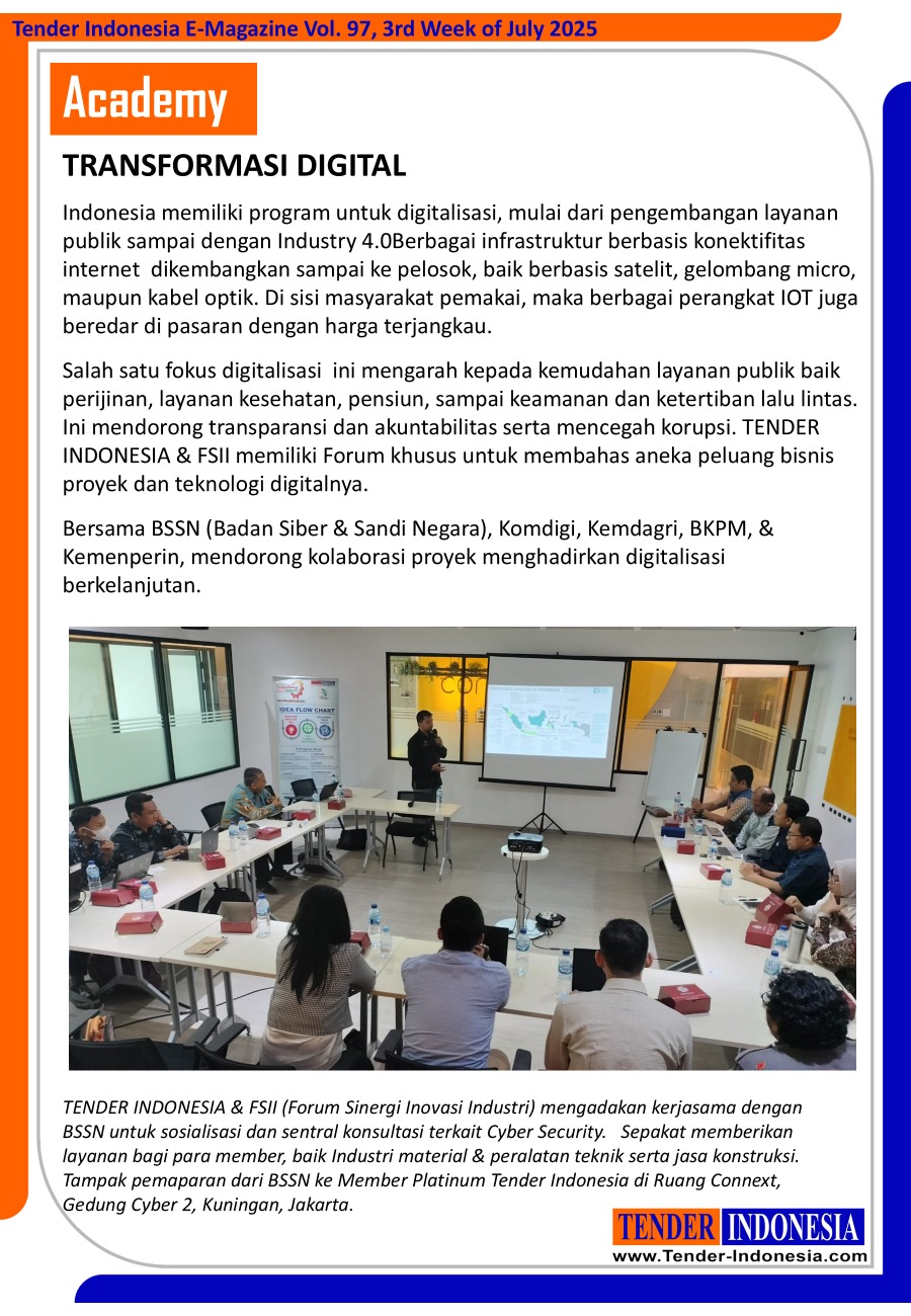 TENDER INDONESIA & FSII (Forum Sinergi Inovasi Industri) mengadakan kerjasama dengan BSSN untuk sosialisasi dan sentral konsultasi terkait Cyber Security. Sepakat memberikan layanan bagi para member, baik Industri material & peralatan teknik serta jasa konstruksi. Tampak pemaparan dari BSSN ke Member Platinum Tender Indonesia di Ruang Connext, Gedung Cyber 2, Kuningan, Jakarta.