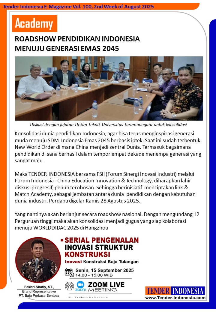 Maka TENDER INDONESIA bersama FSII (Forum Sinergi Inovasi Industri) melalui Forum Indonesia - China Education Innovation & Technology, diharapkan lahir diskusi progresif, penuh terobosan. Sehingga berinisiatif menciptakan link & Match Academy, sebagai jembatan antara dunia pendidikan dengan kebutuhan dunia industri.