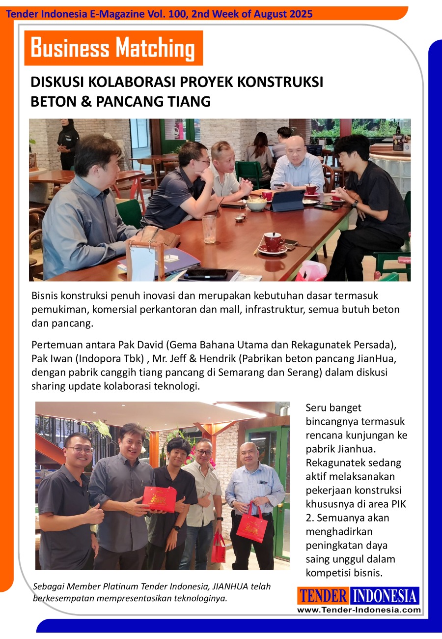 Bisnis konstruksi penuh inovasi dan merupakan kebutuhan dasar termasuk pemukiman, komersial perkantoran dan mall, infrastruktur, semua butuh beton dan pancang. Pertemuan antara Pak David (Gema Bahana Utama dan Rekagunatek Persada), Pak Iwan (Indopora Tbk), Mr. Jeff & Hendrik (Pabrikan beton pancang JianHua, dengan pabrik canggih tiang pancang di Semarang dan Serang) dalam diskusi sharing update kolaborasi teknologi. Sebagai Member Platinum Tender Indonesia, JIANHUA telah berkesempatan mempresentasikan teknologinya.