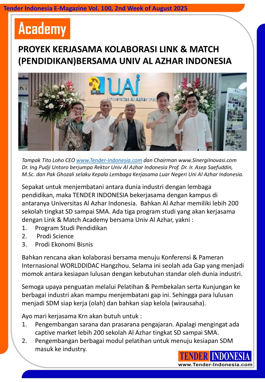 Sepakat untuk menjembatani antara dunia industri dengan lembaga pendidikan, maka TENDER INDONESIA bekerjasama dengan kampus di antaranya Universitas Al Azhar Indonesia. Bahkan Al Azhar memiliki lebih 200 sekolah tingkat SD sampai SMA. Ada tiga program studi yang akan kerjasama dengan Link & Match Academy bersama Univ Al Azhar, yakni : 1.Program Studi Pendidikan 2. Prodi Science 3.Prodi Ekonomi Bisnis