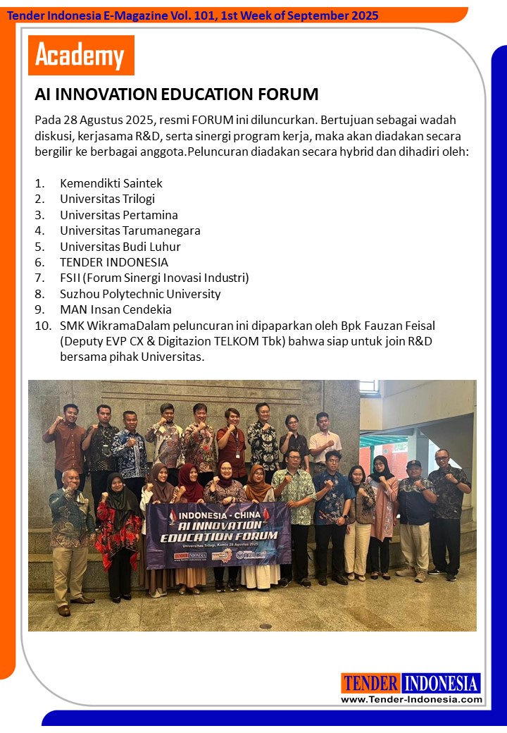 1.Kemendikti Saintek 2.Universitas Trilogi 3.Universitas Pertamina 4.Universitas Tarumanegara 5.Universitas Budi Luhur 6.TENDER INDONESIA 7.FSII (Forum Sinergi Inovasi Industri) 8.Suzhou Polytechnic University 9.MAN Insan Cendekia 10.SMK WikramaDalam peluncuran ini dipaparkan oleh Bpk Fauzan Feisal (Deputy EVP CX & Digitazion TELKOM Tbk) bahwa siap untuk join R&D bersama pihak Universitas.