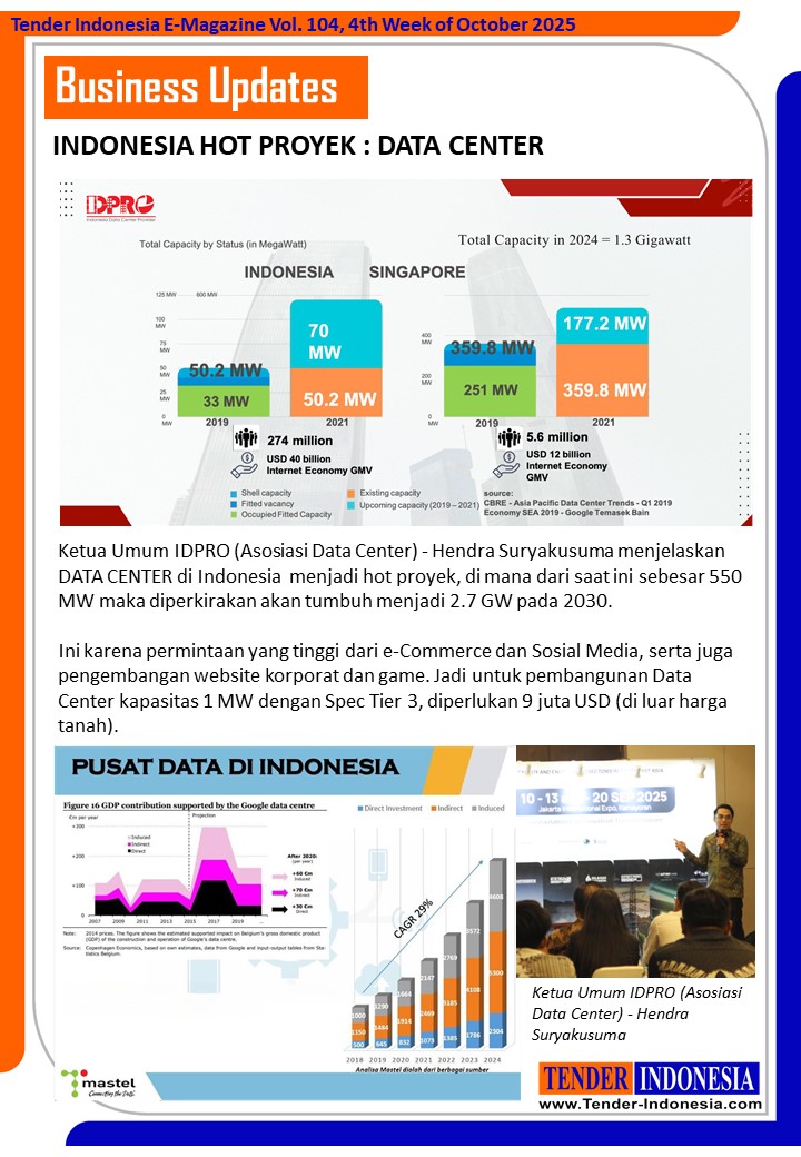 Ketua Umum IDPRO (Asosiasi Data Center) - Hendra Suryakusuma menjelaskan DATA CENTER di Indonesia menjadi hot proyek, di mana dari saat ini sebesar 550 MW maka diperkirakan akan tumbuh menjadi 2.7 GW pada 2030.