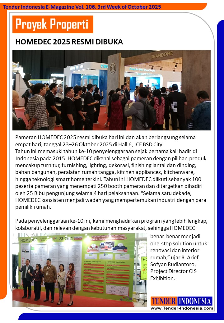 Pameran HOMEDEC 2025 resmi dibuka hari ini dan akan berlangsung selama empat hari, tanggal 23–26 Oktober 2025 di Hall 6, ICE BSD City. Tahun ini memasuki tahun ke-10 penyelenggaraan sejak pertama kali hadir di Indonesia pada 2015. HOMEDEC dikenal sebagai pameran dengan pilihan produk mencakup furnitur, furnishing, lighting, dekorasi, finishing lantai dan dinding, bahan bangunan, peralatan rumah tangga, kitchen appliances, kitchenware, hingga teknologi smart home terkini. Tahun ini HOMEDEC diikuti sebanyak 100 peserta pameran yang menempati 250 booth pameran dan ditargetkan dihadiri oleh 25 Ribu pengunjung selama 4 hari pelaksanaan. “Selama satu dekade, HOMEDEC konsisten menjadi wadah yang mempertemukan industri dengan para pemilik rumah.