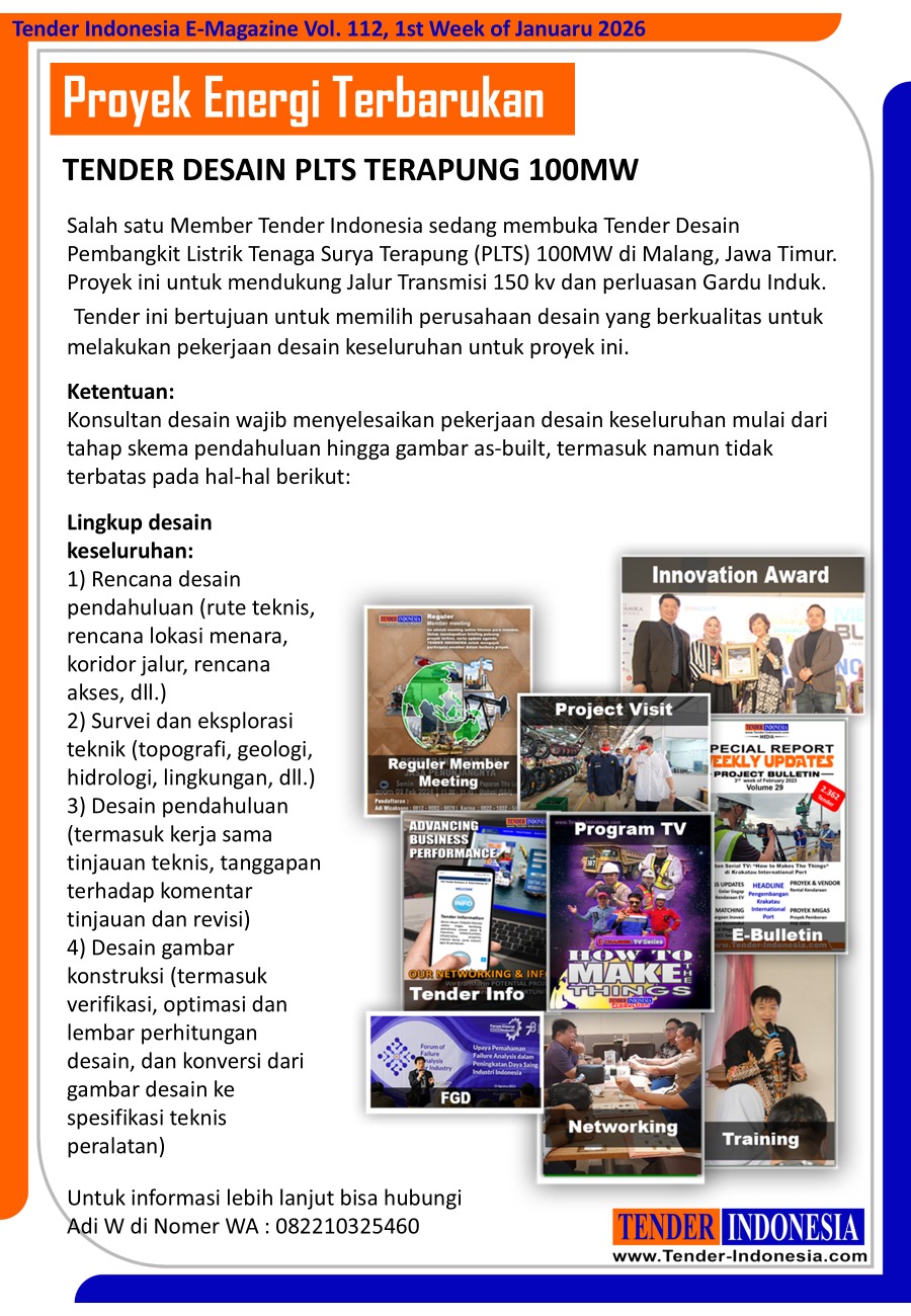 Salah satu Member Tender Indonesia sedang membuka Tender Desain Pembangkit Listrik Tenaga Surya Terapung (PLTS) 100MW di Malang, Jawa Timur. Proyek ini untuk mendukung Jalur Transmisi 150 kv dan perluasan Gardu Induk. Tender ini bertujuan untuk memilih perusahaan desain yang berkualitas untuk melakukan pekerjaan desain keseluruhan untuk proyek ini.