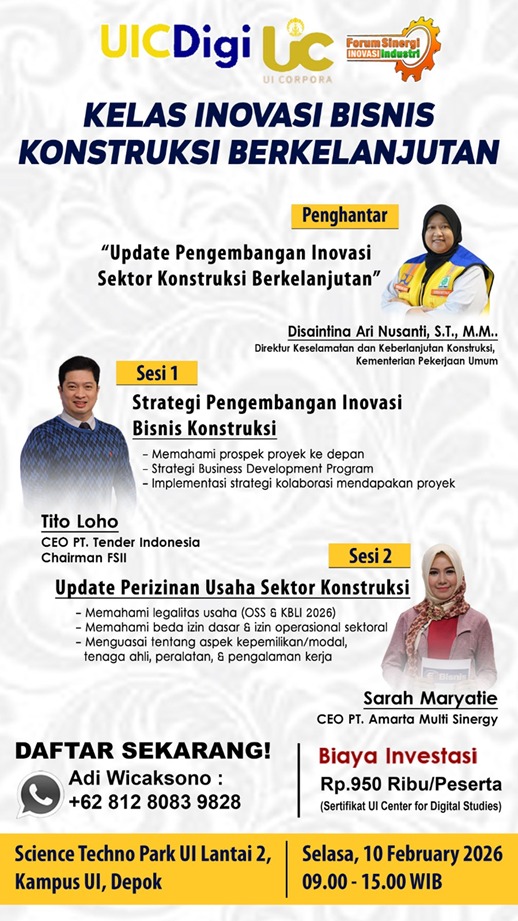 Untuk itu kami ingin mengundang partisipasi dalam pelatihan ini : Tema : “Kelas Inovasi Bisnis Konstruksi Berkelanjutan” Hari : Selasa, 10 -2- 2026 Waktu : Pukul 09.00 - 15.00 Tempat : Science Techno Park UI Biaya : Rp 950.000 / pax Sertifikat : UICDigi