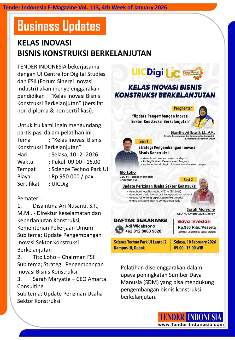 TENDER INDONESIA bekerjasama dengan UI Centre for Digital Studies dan FSII (Forum Sinergi Inovasi Industri) akan menyelenggarakan pendidikan : “Kelas Inovasi Bisnis Konstruksi Berkelanjutan” (bersifat non diploma & non sertifikasi).