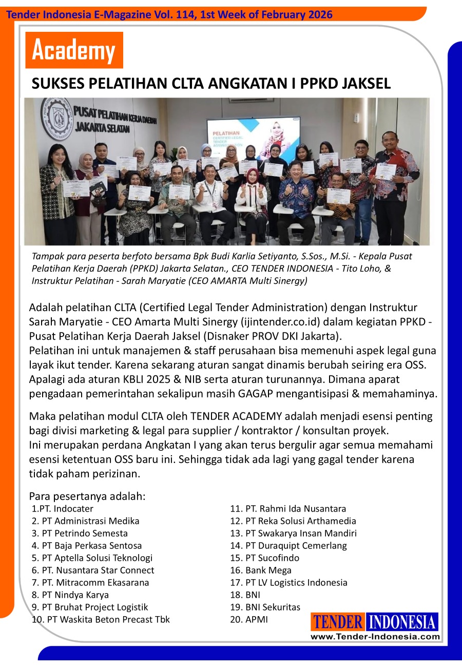 Adalah pelatihan CLTA (Certified Legal Tender Administration) dengan Instruktur Sarah Maryatie - CEO Amarta Multi Sinergy (ijintender.co.id) dalam kegiatan PPKD - Pusat Pelatihan Kerja Daerah Jaksel (Disnaker PROV DKI Jakarta). Pelatihan ini untuk manajemen & staff perusahaan bisa memenuhi aspek legal guna layak ikut tender. Karena sekarang aturan sangat dinamis berubah seiring era OSS. Apalagi ada aturan KBLI 2025 & NIB serta aturan turunannya. Dimana aparat pengadaan pemerintahan sekalipun masih GAGAP mengantisipasi & memahaminya.