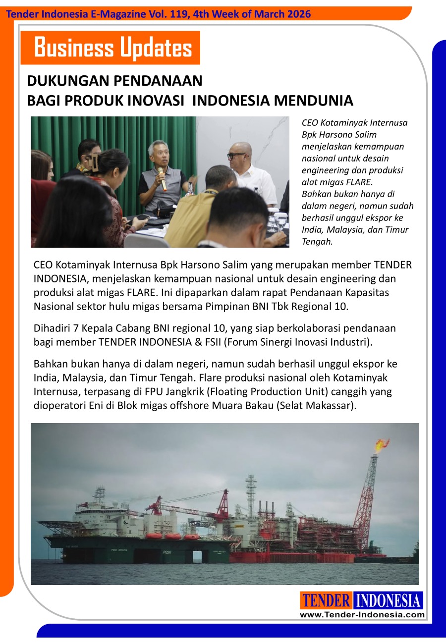Dihadiri 7 Kepala Cabang BNI regional 10, yang siap berkolaborasi pendanaan bagi member TENDER INDONESIA & FSII (Forum Sinergi Inovasi Industri). Bahkan bukan hanya di dalam negeri, namun sudah berhasil unggul ekspor ke India, Malaysia, dan Timur Tengah. Flare produksi nasional oleh Kotaminyak Internusa, terpasang di FPU Jangkrik (Floating Production Unit) canggih yang dioperatori Eni di Blok migas offshore Muara Bakau (Selat Makassar).
