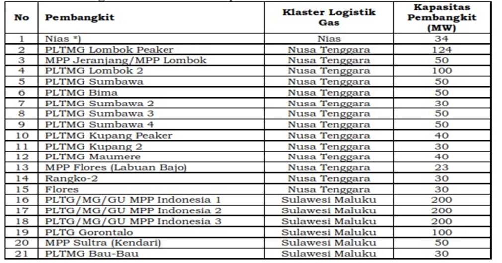 Program gasifikasi dilaksanakan secara bertahap (incremental development concept) dan dibagi dalam beberapa klaster. Gasifikasi tahap I dimulai dengan 39 pembangkit pada 4 klaster yaitu klaster Nias (1 pembangkit, 34 MW), klaster Sulawesi Maluku (12 pembangkit, 1.060 MW), klaster Nusa Tenggara (14 pembangkit, 697 MW) dan klaster Papua Utara (12 pembangkit, 332 MW).