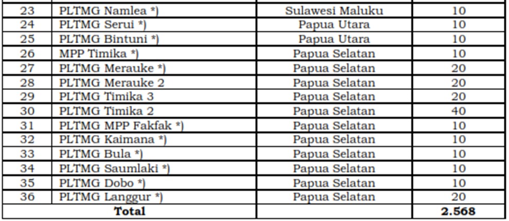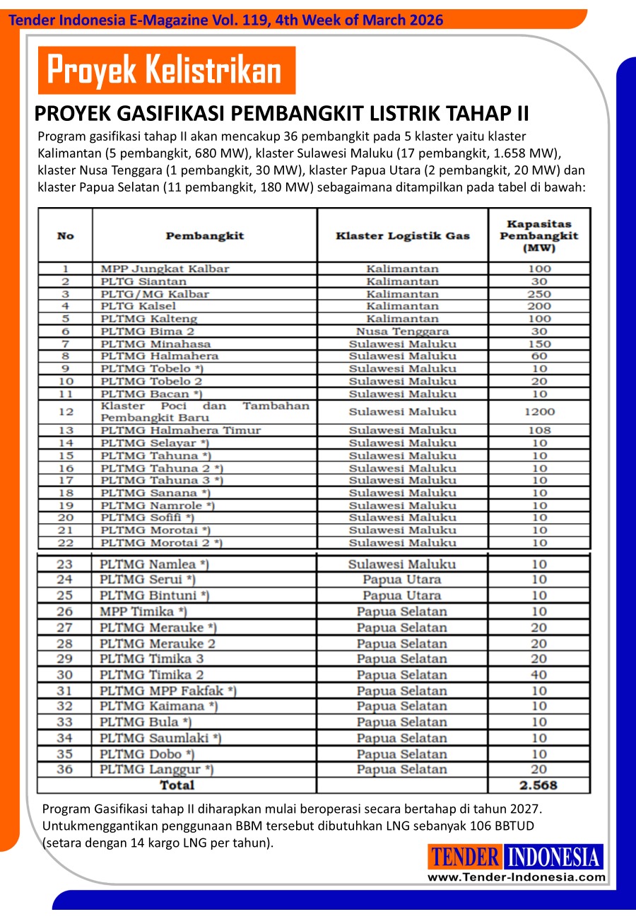 Program gasifikasi tahap II akan mencakup 36 pembangkit pada 5 klaster yaitu klaster Kalimantan (5 pembangkit, 680 MW), klaster Sulawesi Maluku (17 pembangkit, 1.658 MW), klaster Nusa Tenggara (1 pembangkit, 30 MW), klaster Papua Utara (2 pembangkit, 20 MW) dan klaster Papua Selatan (11 pembangkit, 180 MW) sebagaimana ditampilkan pada tabel di bawah: