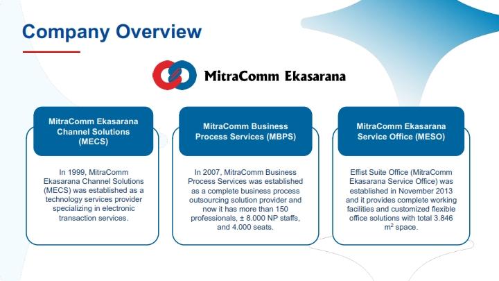 Established in 1999, MitraComm Ekasarana is the leading business process outsourcing (BPO) and technology provider company in Indonesia. With more than 20 years of experience, we offer a complete range of modern business solutions, from business outsourcing teams to innovative payment aggregators, to deliver business success.