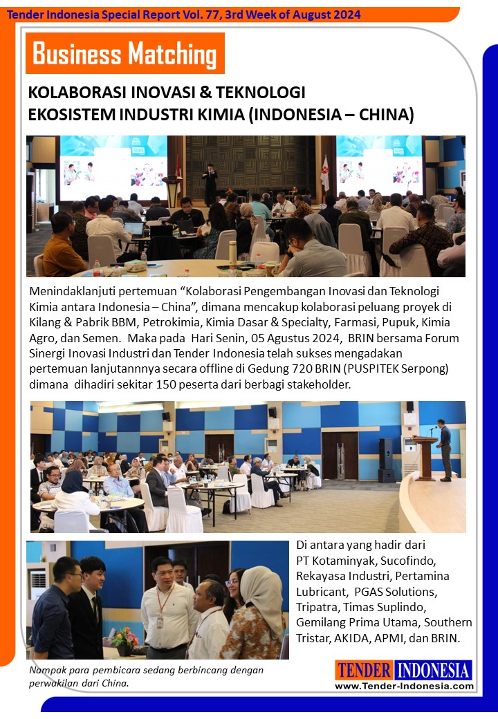 Menindaklanjuti pertemuan “Kolaborasi Pengembangan Inovasi dan Teknologi Kimia antara Indonesia – China”, dimana mencakup kolaborasi peluang proyek di Kilang & Pabrik BBM, Petrokimia, Kimia Dasar & Specialty, Farmasi, Pupuk, Kimia Agro, dan Semen. Maka pada Hari Senin, 05 Agustus 2024, BRIN bersama Forum Sinergi Inovasi Industri dan Tender Indonesia telah sukses mengadakan pertemuan lanjutannnya secara offline di Gedung 720 BRIN (PUSPITEK Serpong) dimana dihadiri sekitar 150 peserta dari berbagi stakeholder.
