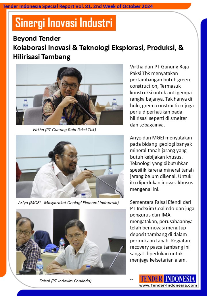 Virtha dari PT Gunung Raja Paksi Tbk menyatakan pertambangan butuh green construction, Termasuk konstruksi untuk anti gempa rangka bajanya. Tak hanya di hulu, green construction juga perlu diperhatikan pada hilirisasi seperti di smelter dan sebagainya.