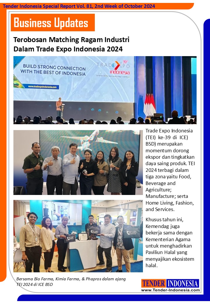 Trade Expo Indonesia (TEI) ke-39 di ICE) BSD) merupakan momentum dorong ekspor dan tingkatkan daya saing produk. TEI 2024 terbagi dalam tiga zona yaitu Food, Beverage and Agriculture; Manufacture; serta Home Living, Fashion, and Services. Khusus tahun ini, Kemendag juga bekerja sama dengan Kementerian Agama untuk menghadirkan Paviliun Halal yang menyajikan ekosistem halal.