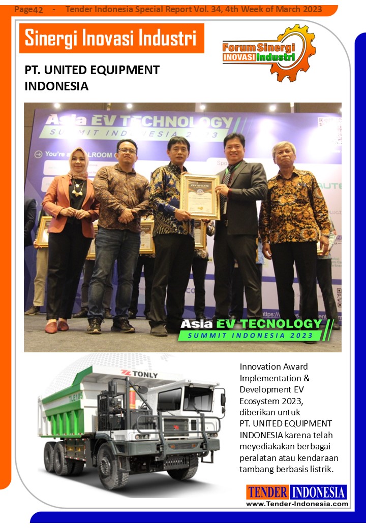 Innovation Award Implementation & Development EV Ecosystem 2023, diberikan untuk PT. UNITED EQUIPMENT INDONESIA karena telah meyediakakan berbagai peralatan atau kendaraan tambang berbasis listrik.