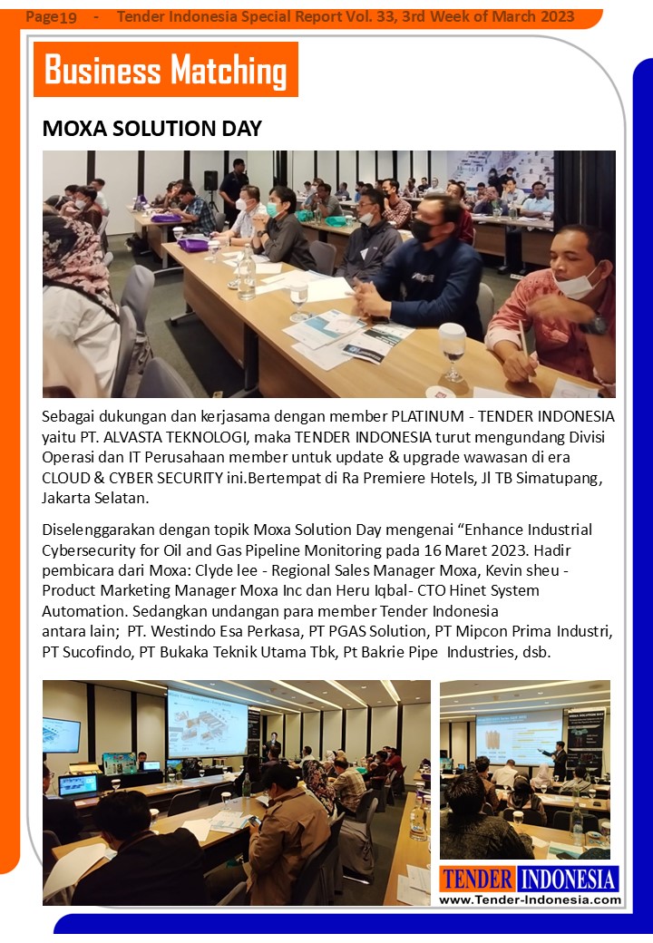Diselenggarakan dengan topik Moxa Solution Day mengenai “Enhance Industrial Cybersecurity for Oil and Gas Pipeline Monitoring pada 16 Maret 2023. Hadir pembicara dari Moxa: Clyde lee - Regional Sales Manager Moxa, Kevin sheu - Product Marketing Manager Moxa Inc dan Heru Iqbal- CTO Hinet System Automation. Sedangkan undangan para member Tender Indonesia antara lain; PT. Westindo Esa Perkasa, PT PGAS Solution, PT Mipcon Prima Industri, PT Sucofindo, PT Bukaka Teknik Utama Tbk, Pt Bakrie Pipe Industries, dsb.