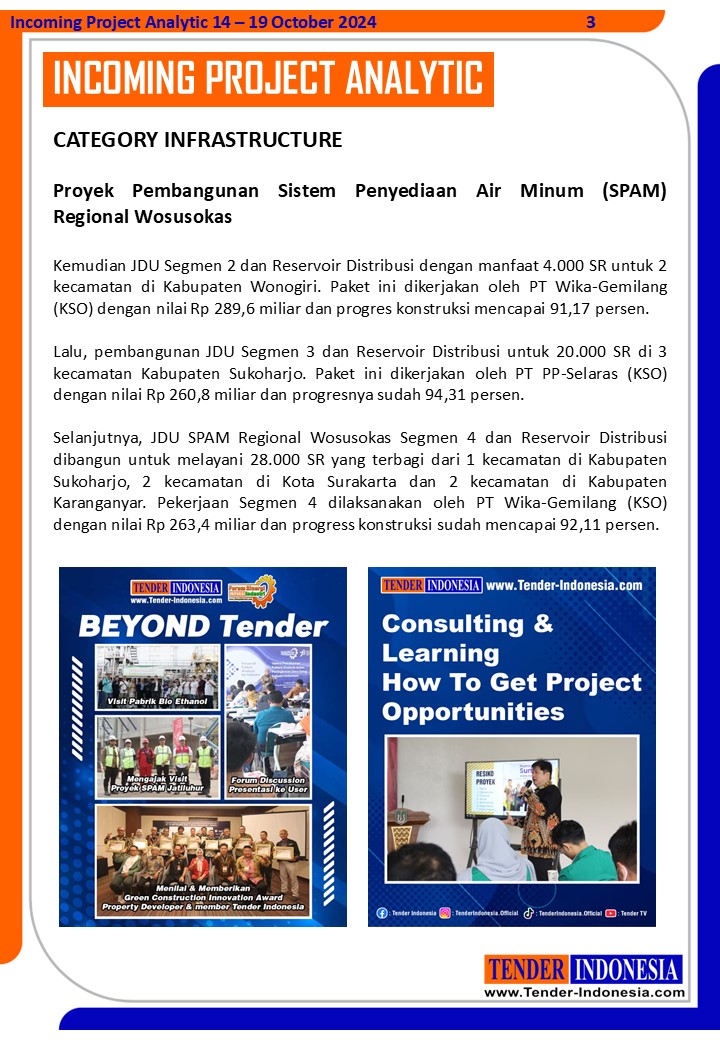 Lalu, pembangunan JDU Segmen 3 dan Reservoir Distribusi untuk 20.000 SR di 3 kecamatan Kabupaten Sukoharjo. Paket ini dikerjakan oleh PT PP-Selaras (KSO) dengan nilai Rp 260,8 miliar dan progresnya sudah 94,31 persen.