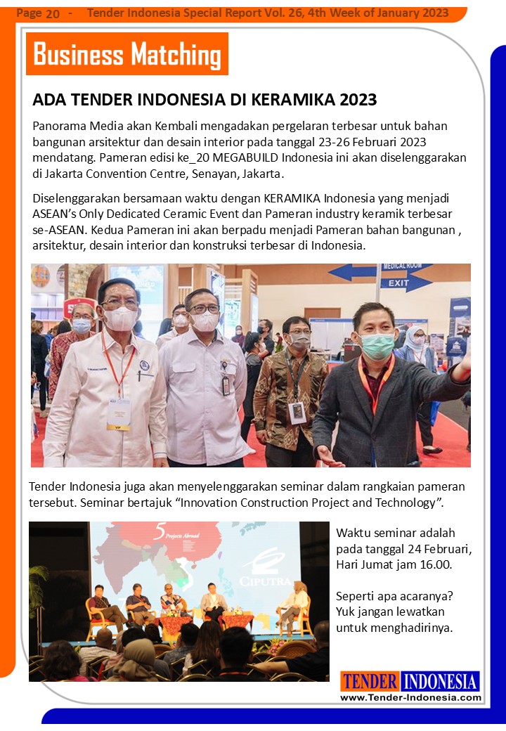 Tender Indonesia juga akan menyelenggarakan seminar dalam rangkaian pameran tersebut. Seminar bertajuk “Innovation Construction Project and Technology”. Waktu seminar adalah pada tanggal 24 Februari, Hari Jumat jam 16.00.