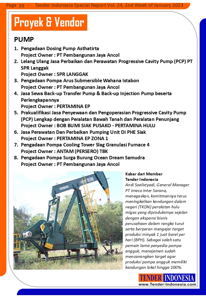 Andi Soelistyadi, General Manager PT Imeco Inter Sarana, menegaskan, komitmennya terus meningkatkan kandungan dalam negeri (TKDN) peralatan hulu migas yang diproduksinya sejalan dengan ekspansi bisnis perusahaan dalam rangka turut serta berperan mengejar target produksi minyak 1 juat barel per hari (BPH). Sebagai salah satu pemain lama penyedia pompa angguk, manajemen sudah mencanangkan target agar produksi pompa angguk memiliki kandungan lokal hingga 100%.