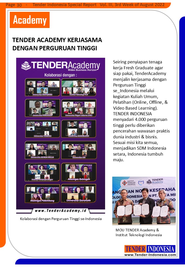 Seiring penyiapan tenaga kerja Fresh Graduate agar siap pakai, TenderAcademy menjalin kerjasama dengan Perguruan Tinggi se_Indonesia melalui kegiatan Kuliah Umum, Pelatihan (Online, Offline, & Video Based Learning). TENDER INDONESIA menyadari 4.000 perguruan tinggi perlu diberikan pencerahan wawasan praktis dunia industri & bisnis. Sesuai misi kita semua, menjadikan SDM Indonesia setara, Indonesia tumbuh maju.