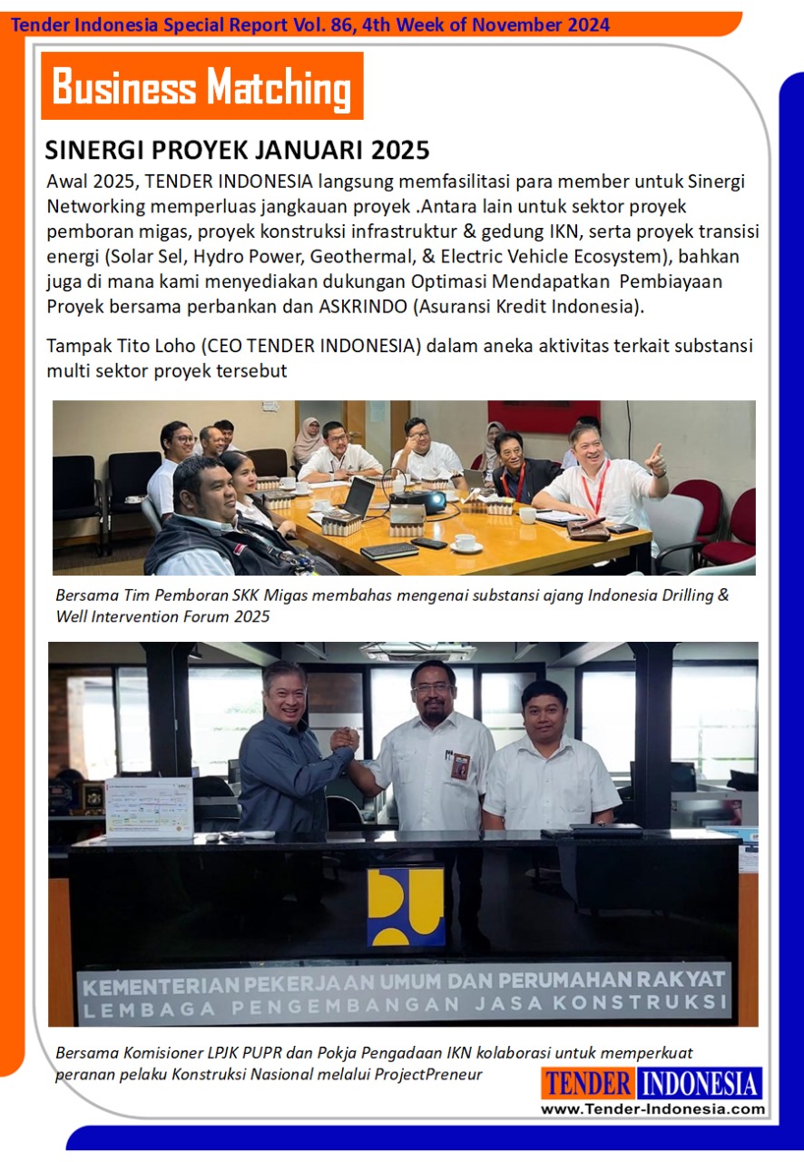 Awal 2025, TENDER INDONESIA langsung memfasilitasi para member untuk Sinergi Networking memperluas jangkauan proyek .Antara lain untuk sektor proyek pemboran migas, proyek konstruksi infrastruktur & gedung IKN, serta proyek transisi energi (Solar Sel, Hydro Power, Geothermal, & Electric Vehicle Ecosystem), bahkan juga di mana kami menyediakan dukungan Optimasi Mendapatkan Pembiayaan Proyek bersama perbankan dan ASKRINDO (Asuransi Kredit Indonesia).