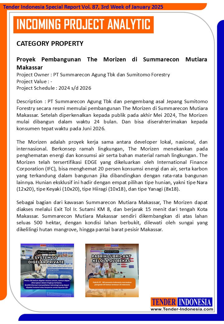 Project Owner : PT Summarecon Agung Tbk dan Sumitomo Forestry Project Value : - Project Schedule : 2024 s/d 2026