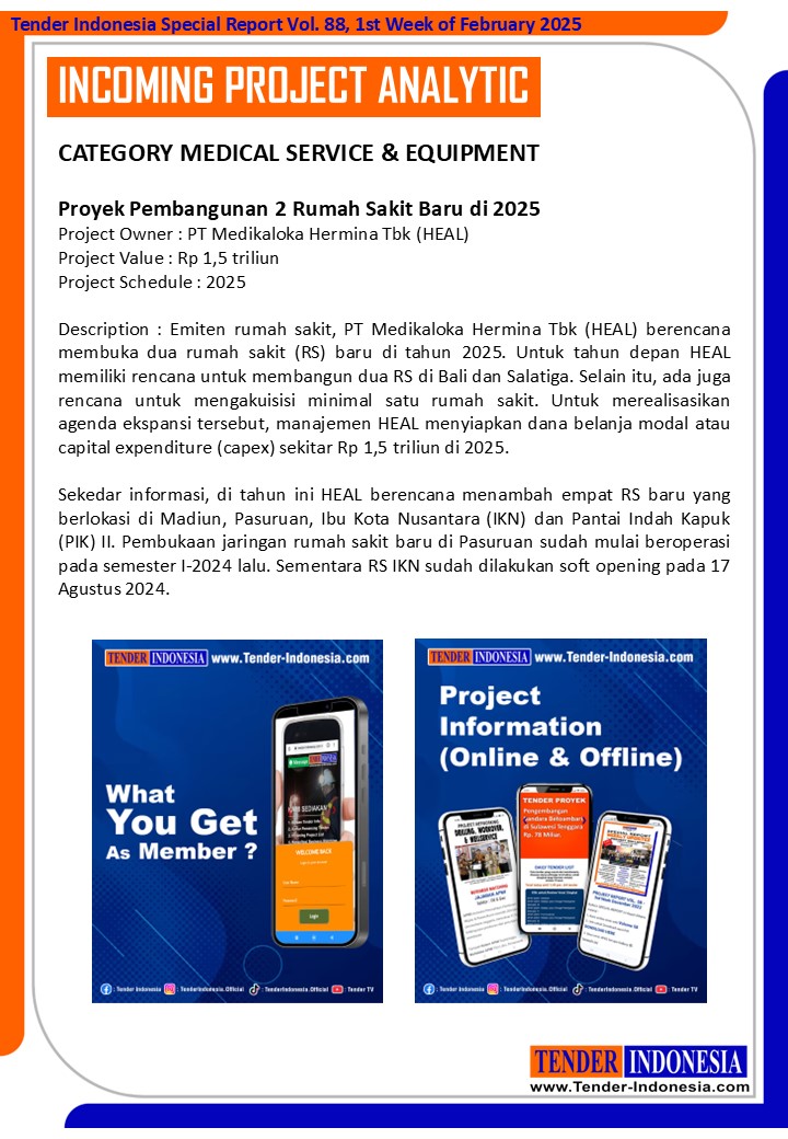 Project Owner : PT Medikaloka Hermina Tbk (HEAL) Project Value : Rp 1,5 triliun Project Schedule : 2025