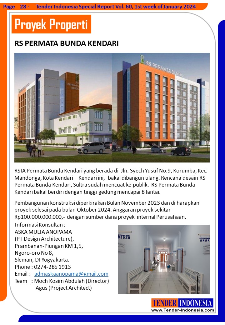 RSIA Permata Bunda Kendari yang berada di Jln. Syech Yusuf No.9, Korumba, Kec. Mandonga, Kota Kendari – Kendari ini, bakal dibangun ulang. Rencana desain RS Permata Bunda Kendari, Sultra sudah mencuat ke publik. RS Permata Bunda Kendari bakal berdiri dengan tinggi gedung mencapai 8 lantai.