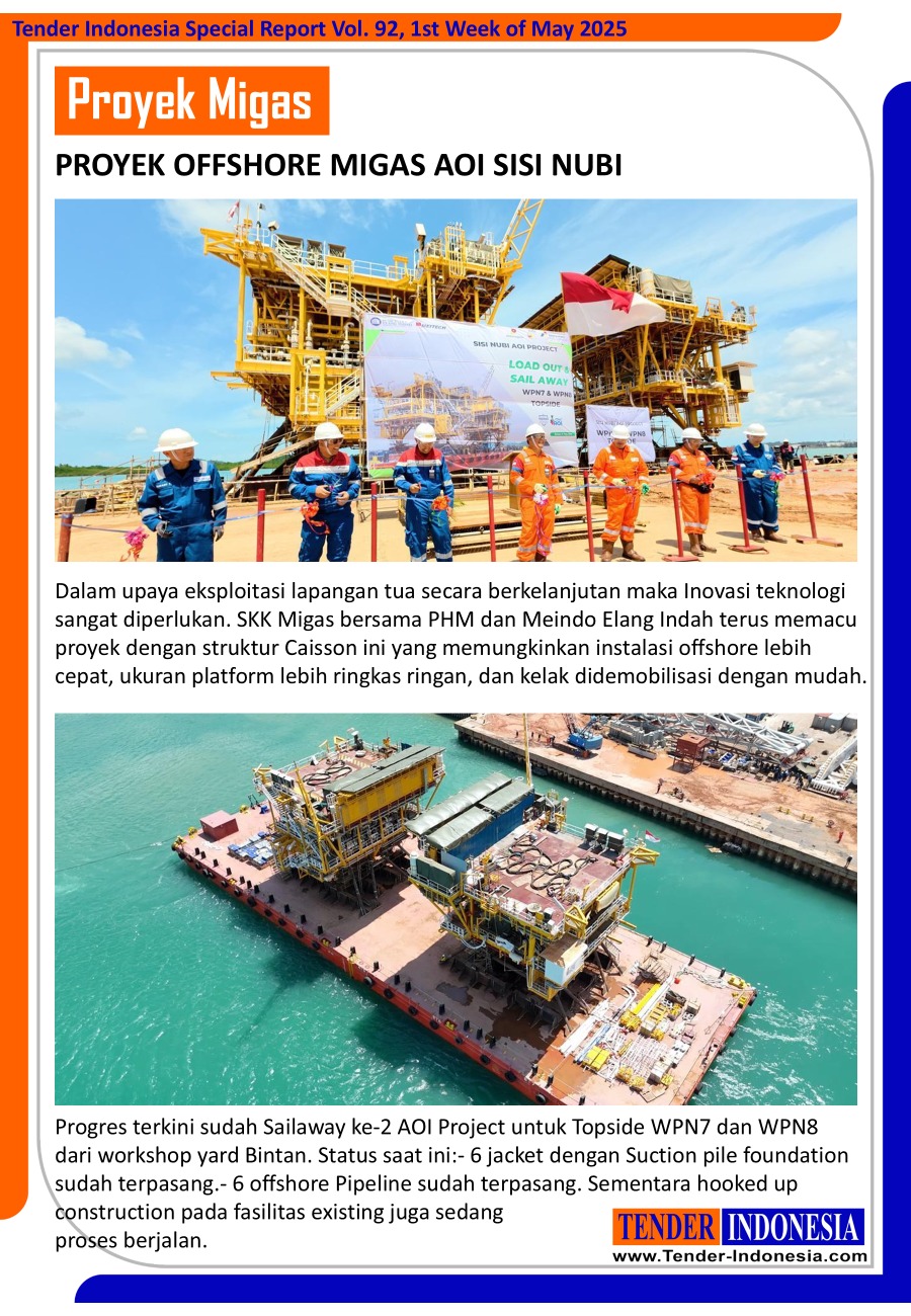 Progres terkini sudah Sailaway ke-2 AOI Project untuk Topside WPN7 dan WPN8 dari workshop yard Bintan. Status saat ini: 6 jacket dengan Suction pile foundation sudah terpasang, 6 offshore Pipeline sudah terpasang, Sementara hooked up construction pada fasilitas existing juga sedang proses berjalan.