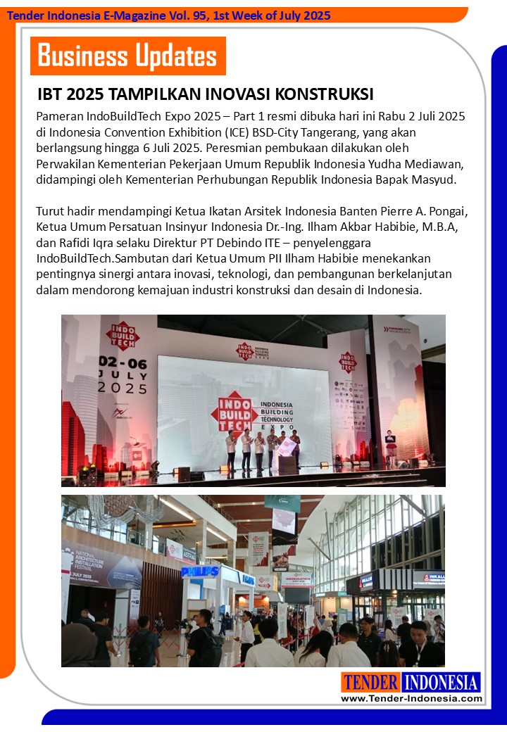 Pameran IndoBuildTech Expo 2025 – Part 1 resmi dibuka hari ini Rabu 2 Juli 2025 di Indonesia Convention Exhibition (ICE) BSD-City Tangerang, yang akan berlangsung hingga 6 Juli 2025. Peresmian pembukaan dilakukan oleh Perwakilan Kementerian Pekerjaan Umum Republik Indonesia Yudha Mediawan, didampingi oleh Kementerian Perhubungan Republik Indonesia Bapak Masyud.