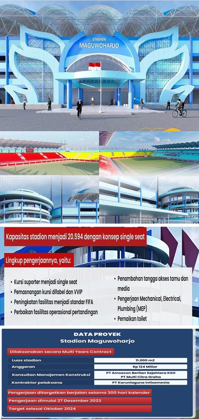 Untuk difabel dan VVIP. Lalu, peningkatan fasilitas standar FIFA, penambahan tangga untuk akses media dan penonton tamu, perbaikan toilet, dan pekerjaan sistem Mechanical, Electrical, Plumbing (MEP). Rehabilitasi dan renovasi stadion seluas 11.000 meter persegi ini dilaksanakan secara Multi Years Contract (MYC) TA 2023-2024 dengan jangka waktu 300 hari kalender.