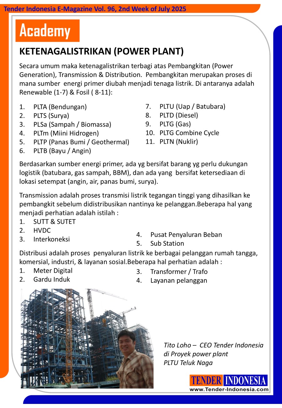 Secara umum maka ketenagalistrikan terbagi atas Pembangkitan (Power Generation), Transmission & Distribution. Pembangkitan merupakan proses di mana sumber energi primer diubah menjadi tenaga listrik. Di antaranya adalah Renewable (1-7) & Fosil ( 8-11): 1.PLTA (Bendungan) 2.PLTS (Surya) 3.PLSa (Sampah / Biomassa) 4.PLTm (Miini Hidrogen) 5.PLTP (Panas Bumi / Geothermal) 6.PLTB (Bayu / Angin 7.PLTU (Uap / Batubara) 8.PLTD (Diesel) 9.PLTG (Gas) 10.PLTG Combine Cycle 11.PLTN (Nuklir