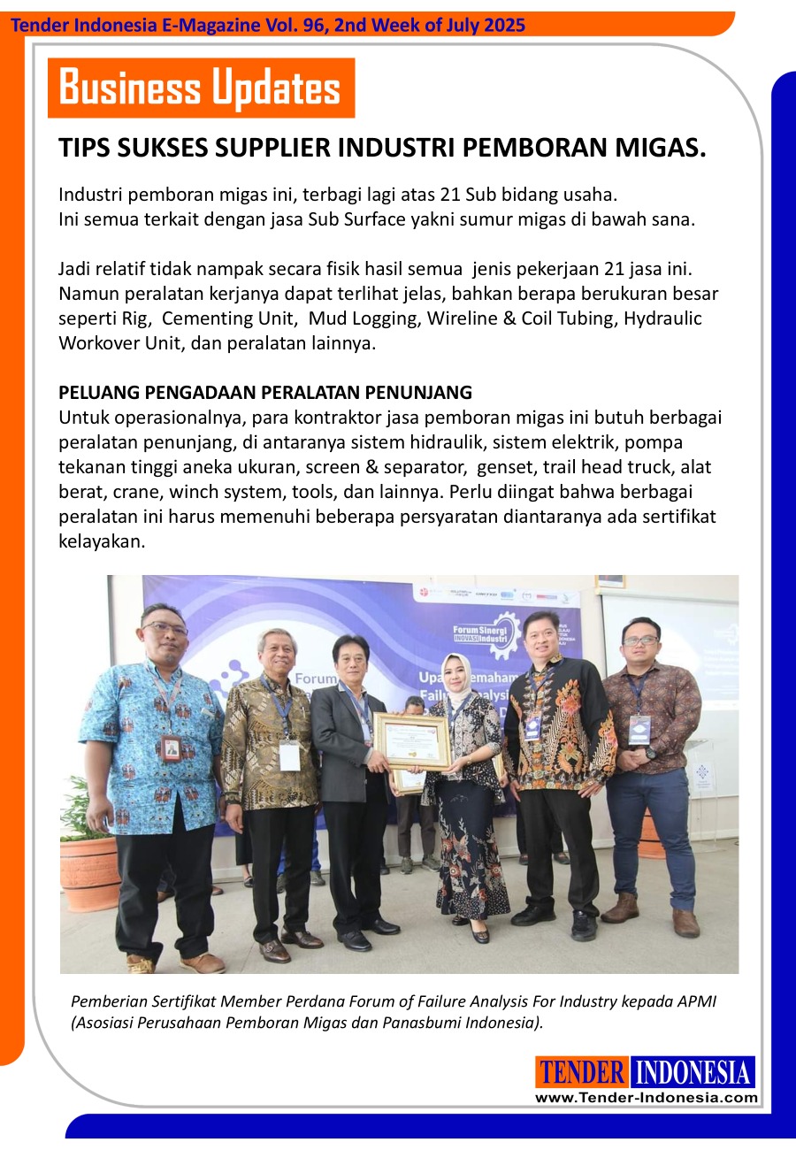 PELUANG PENGADAAN PERALATAN PENUNJANG Untuk operasionalnya, para kontraktor jasa pemboran migas ini butuh berbagai peralatan penunjang, di antaranya sistem hidraulik, sistem elektrik, pompa tekanan tinggi aneka ukuran, screen & separator, genset, trail head truck, alat berat, crane, winch system, tools, dan lainnya. Perlu diingat bahwa berbagai peralatan ini harus memenuhi beberapa persyaratan diantaranya ada sertifikat kelayakan.