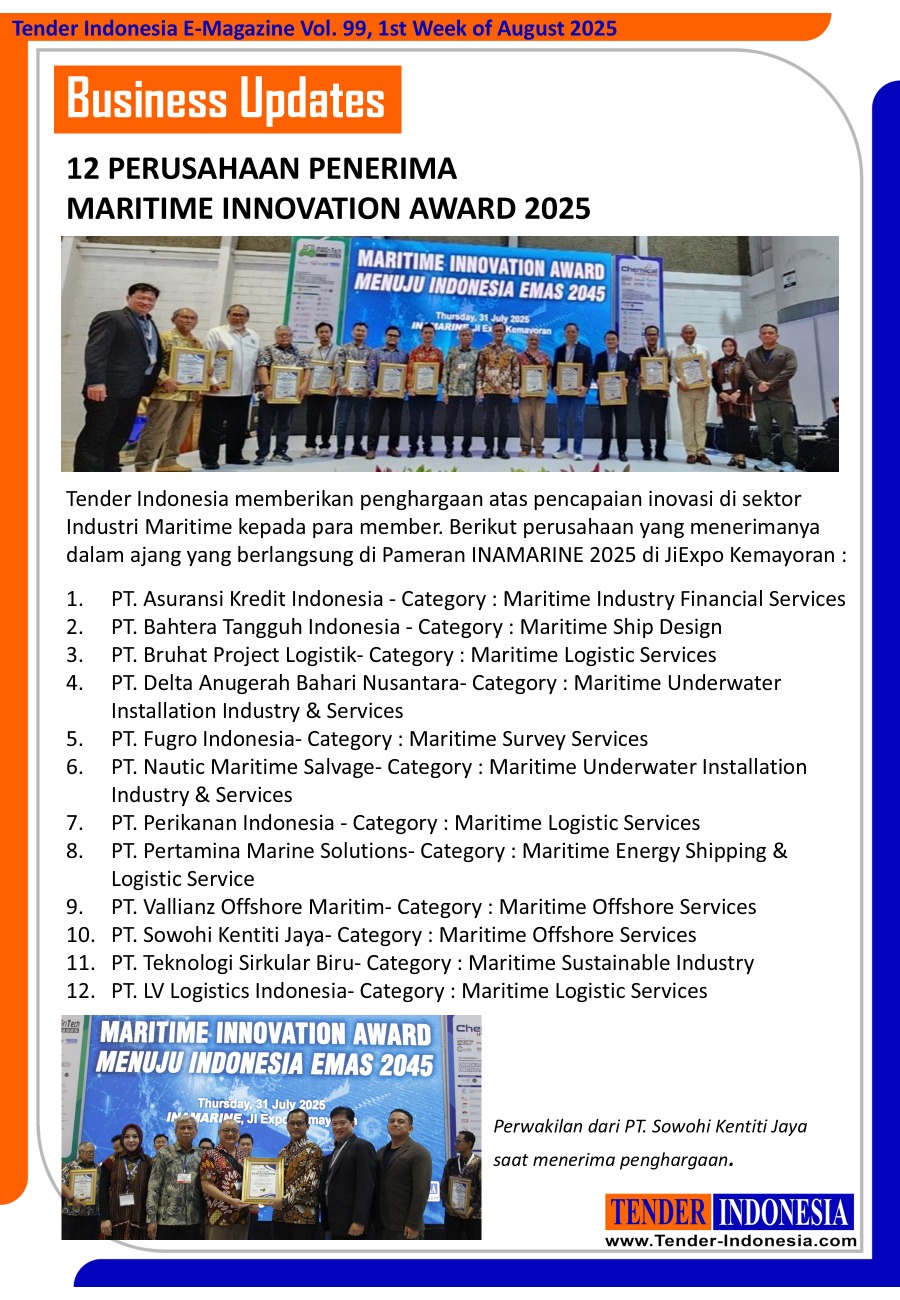 Tender Indonesia memberikan penghargaan atas pencapaian inovasi di sektor Industri Maritime kepada para member. Berikut perusahaan yang menerimanya dalam ajang yang berlangsung di Pameran INAMARINE 2025 di JiExpo Kemayoran :