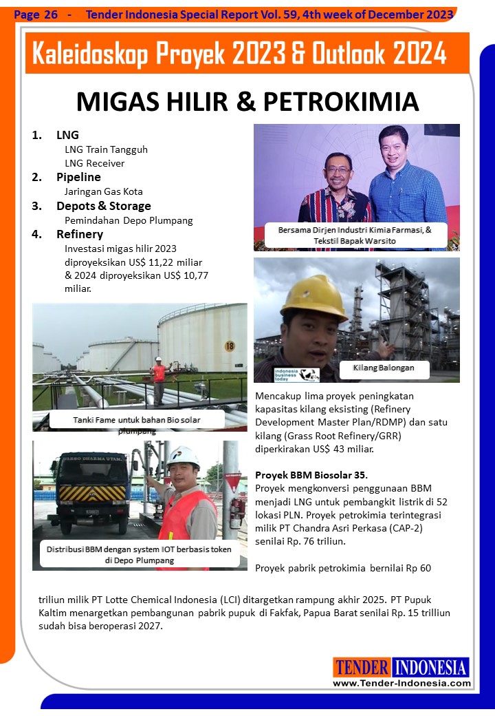 1.LNG LNG Train Tangguh LNG Receiver 2.Pipeline Jaringan Gas Kota 3.Depots & Storage Pemindahan Depo Plumpang 4. Refinery Investasi migas hilir 2023 diproyeksikan US$ 11,22 miliar & 2024 diproyeksikan US$ 10,77 miliar. Mencakup lima proyek peningkatan kapasitas kilang eksisting (Refinery Development Master Plan/RDMP) dan satu kilang (Grass Root Refinery/GRR) diperkirakan US$ 43 miliar.