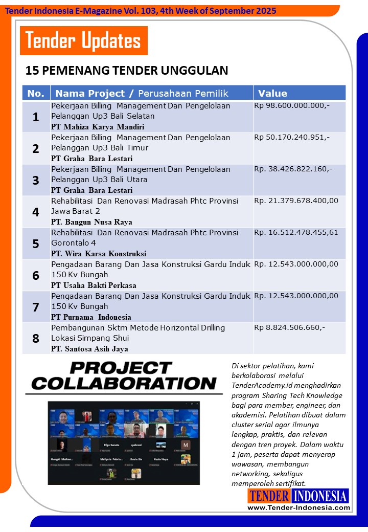 Di sektor pelatihan, kami berkolaborasi melalui TenderAcademy.id menghadirkan program Sharing Tech Knowledge bagi para member, engineer, dan akademisi. Pelatihan dibuat dalam cluster serial agar ilmunya lengkap, praktis, dan relevan dengan tren proyek. Dalam waktu 1 jam, peserta dapat menyerap wawasan, membangun networking, sekaligus memperoleh sertifikat.