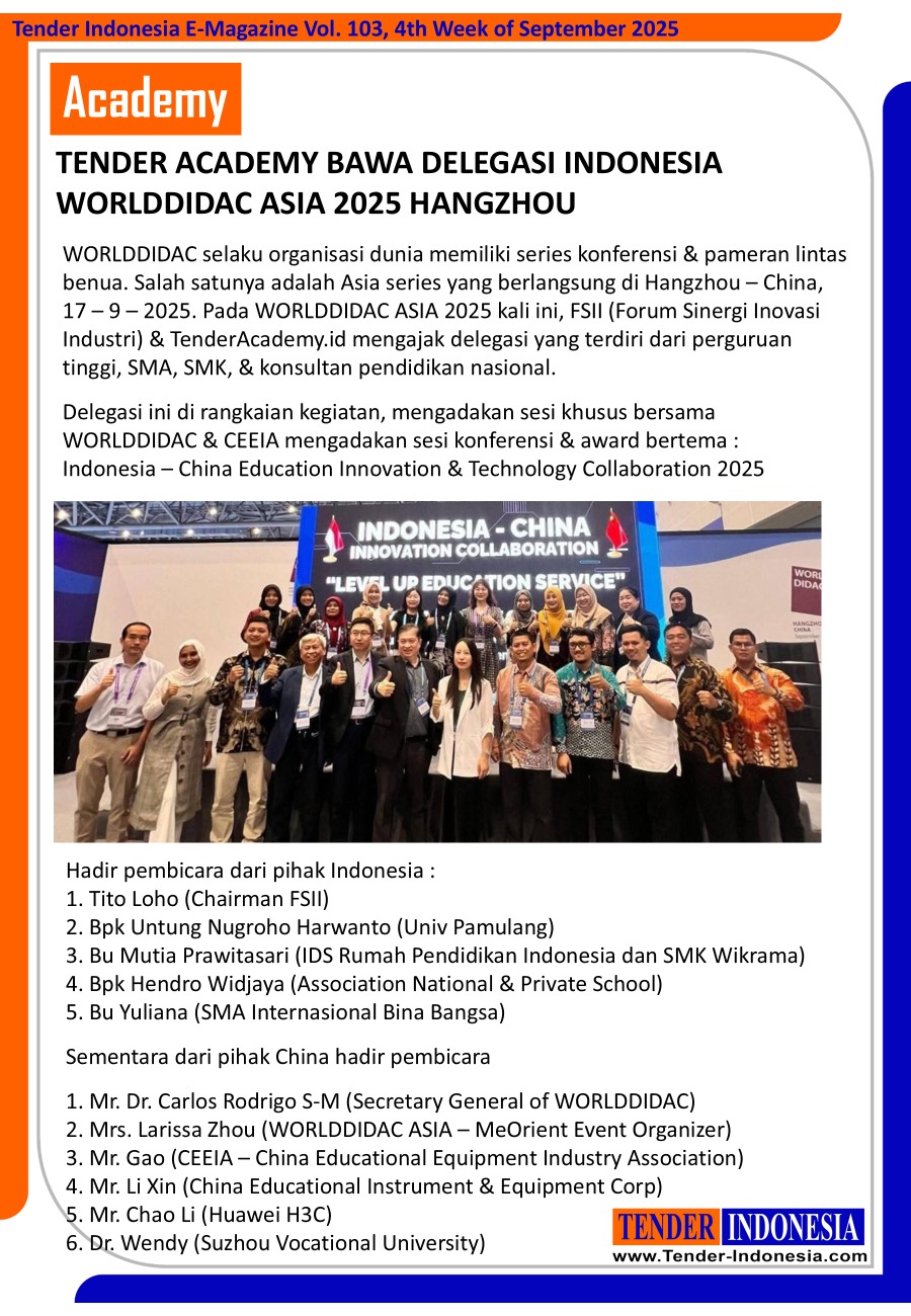 WORLDDIDAC selaku organisasi dunia memiliki series konferensi & pameran lintas benua. Salah satunya adalah Asia series yang berlangsung di Hangzhou – China, 17 – 9 – 2025. Pada WORLDDIDAC ASIA 2025 kali ini, FSII (Forum Sinergi Inovasi Industri) & TenderAcademy.id mengajak delegasi yang terdiri dari perguruan tinggi, SMA, SMK, & konsultan pendidikan nasional.