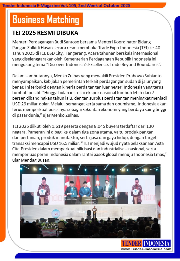 Menteri Perdagangan Budi Santoso bersama Menteri Koordinator Bidang Pangan Zulkifli Hasan secara resmi membuka Trade Expo Indonesia (TEI) ke-40 Tahun 2025 di ICE BSD City, Tangerang. Acara tahunan berskala internasional yang diselenggarakan oleh Kementerian Perdagangan Republik Indonesia ini mengusung tema “Discover Indonesia’s Excellence: Trade Beyond Boundaries”.