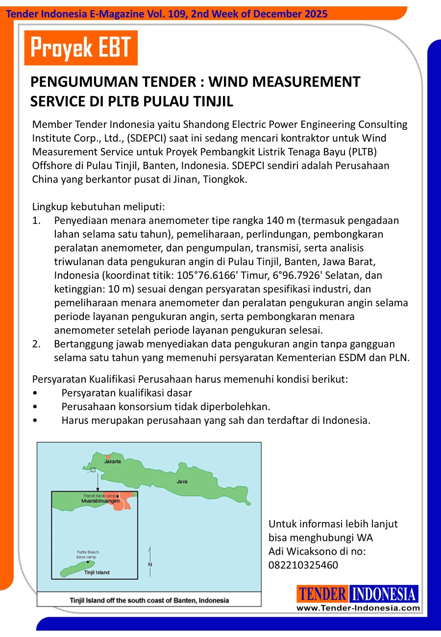 Member Tender Indonesia yaitu Shandong Electric Power Engineering Consulting Institute Corp., Ltd., (SDEPCI) saat ini sedang mencari kontraktor untuk Wind Measurement Service untuk Proyek Pembangkit Listrik Tenaga Bayu (PLTB) Offshore di Pulau Tinjil, Banten, Indonesia. SDEPCI sendiri adalah Perusahaan China yang berkantor pusat di Jinan, Tiongkok.