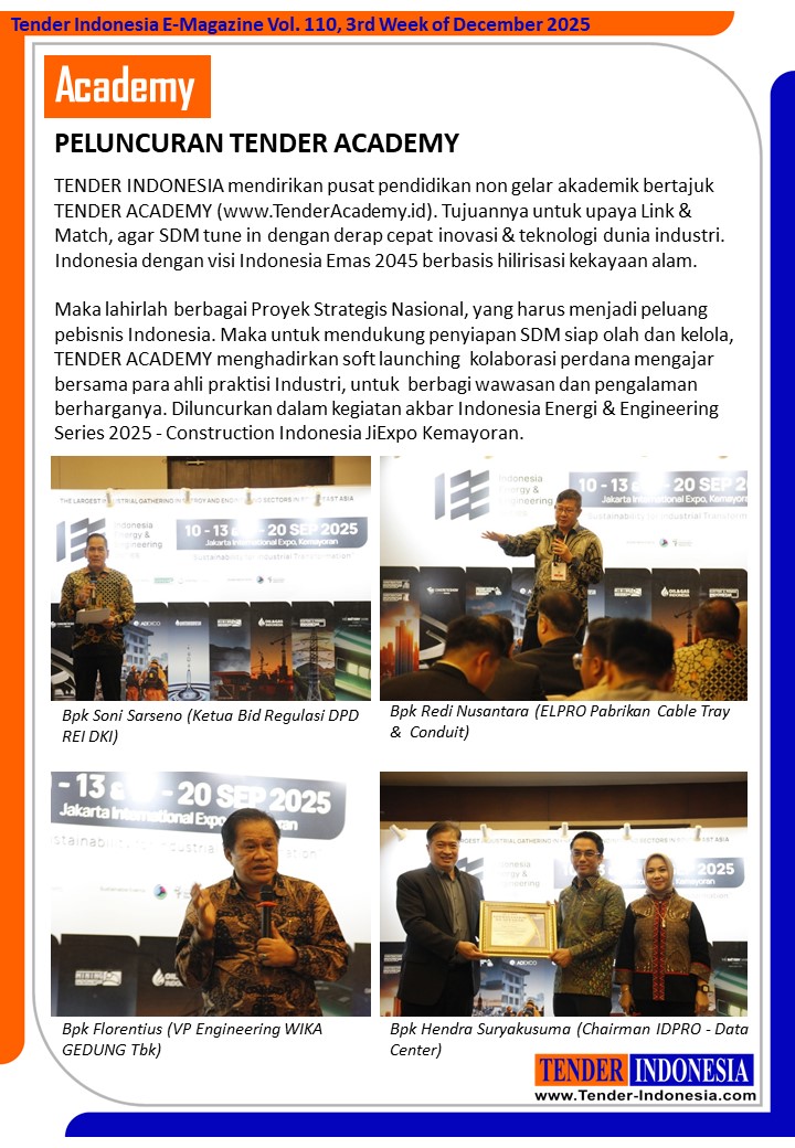 Maka lahirlah berbagai Proyek Strategis Nasional, yang harus menjadi peluang pebisnis Indonesia. Maka untuk mendukung penyiapan SDM siap olah dan kelola, TENDER ACADEMY menghadirkan soft launching kolaborasi perdana mengajar bersama para ahli praktisi Industri, untuk berbagi wawasan dan pengalaman berharganya. Diluncurkan dalam kegiatan akbar Indonesia Energi & Engineering Series 2025 - Construction Indonesia JiExpo Kemayoran.